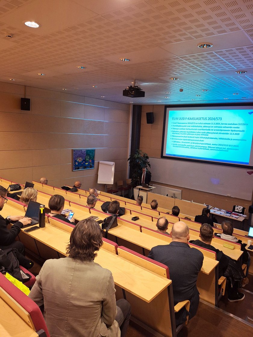 Ryhmäpäällikkö Markus Kauppinen Tukesista kävi tilaisuudessa luennoimassa siitä, miten uusi F-kaasuasetus vaikuttaa kylmäalan pätevyyksiin Suomessa. Kyseessä on merkittävä ympäristöä koskeva EU-säädös, joka pyrkii vähentämään ilmastoa lämmittävien fluorattujen kasvihuonekaasujen käyttöä ja päästöjä.
